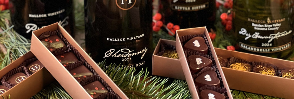 Celebrate the season with a quartet of perfect pairings—four artisan wines, each matched with its own handcrafted chocolate truffle infused with that very wine. Together, they create a luxurious tasting experience made for cozy gatherings, thoughtful gifting, and savoring every holiday moment.